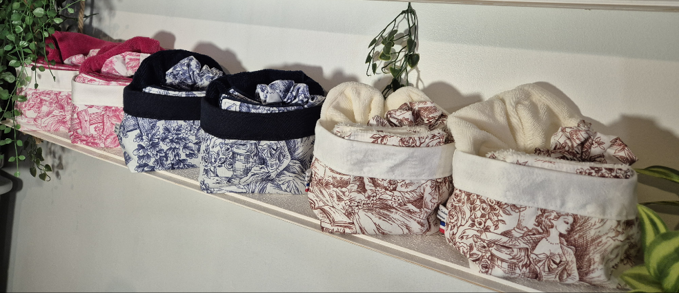 Panier 14x9x11cm. Coton et toile Lingettes 10x10cm. Coton et éponge bambous Fleur de bain 20cm. éponges bambous