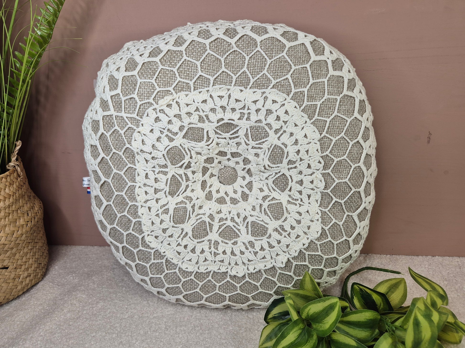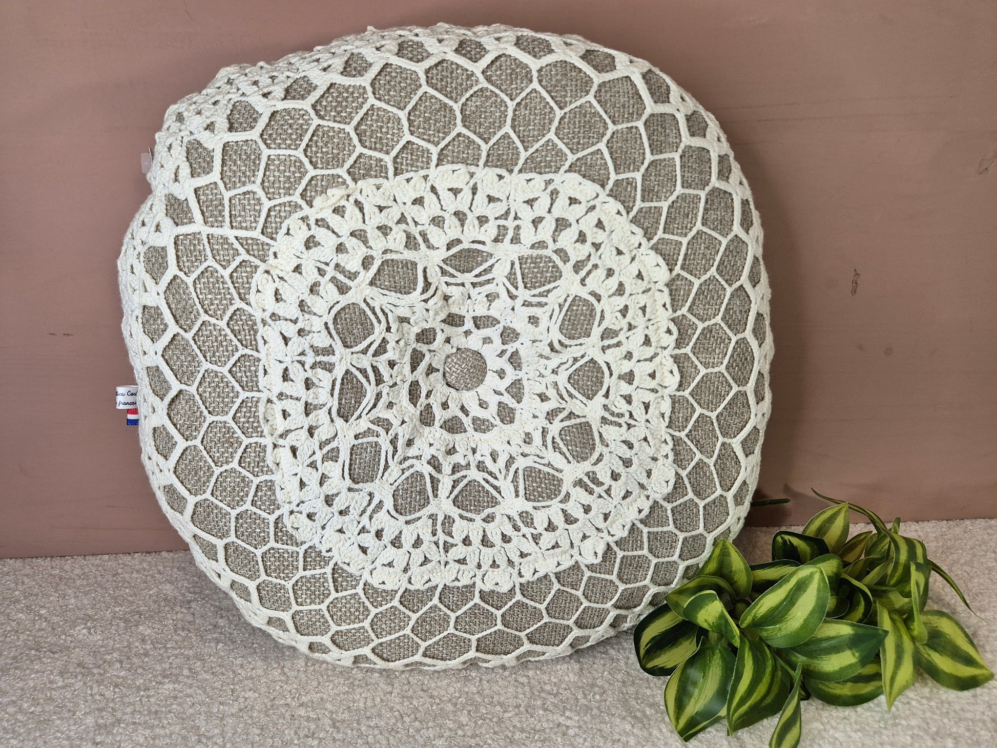 Ce coussin de 55 cm arrondi est fabriqué à partir d'un napperon ancien, garni de ouate pour un confort optimal. Son dos en tissu de qualité beige et son bouton décoratif central ajoutent une touche d'élégance à votre décoration. Offrez-vous un produit unique alliant tradition et modernité.